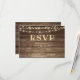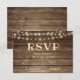 A rustic, country wedding RSVP card with a weathered wood plank background and yellow glow string lights. All text is editable and the font style, size, color and placement can be changed to accommodate your needs by clicking on the "click to customize further" tab. The back of the invitation features the same wood plank background.