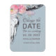 This rustic themed wedding change the date announcement magnetic card is for when couple's need to change their wedding date for whatever reason they have. This boho inspired design template features hand drawn and painted cow skull wearing a blush pink watercolor floral headdress on a background of white and gray weathered wood. To the right is your change the date announcement in black script typography. Personalize with your names and new wedding date. Designed by artist Susan Coffey.