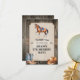 Saddle up and gallop over for a fun horseback riding themed birthday party. A wood plank background suggests the interior of a stable with a panel held on by burlap straps. The cream-colored panel has a horse watermark. At the top, a horse is saddled up to thank guests for taking part in a fun day with horses. A pair of cowboy boots and a cowboy hat are placed towards the bottom of the card with western-style ornaments accenting the design. Available with matching products.