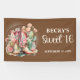 Sweet 16 birthday party custom banner designed on a rustic brown background with cowgirl boots and pink roses. Personalized with the name of the guest of honor and her party date.
