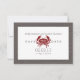 A rustic beach wedding save the date featuring an illustration of a crab on front and a rustic weathered wood border.