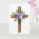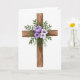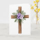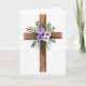 This design shows a watercolor-style wooden cross in earthy brown tones, with careful grain details that give it a rustic, touchable look against a bright white background. At the point where the beams meet, a gathered bouquet of greenery and purple flowers leans in close, like a gentle embrace between old friends. Leaves in fresh greens—some broad and soft, others fine and fernlike—fan outward to frame the blooms and add a springtime lift 🌷. The blossoms range from pale lavender to deep violet, and their darker centers add contrast that draws your eye back to the middle. A short Easter greeting is placed near the top in a soft gray, while a smaller line sits near the bottom in muted purple, keeping the focus on the artwork. The paint washes stay light and airy, with edges that fade slightly, giving the scene a calm, tender mood 🐇. Fine splatters and translucent layers around the flowers add depth, and the white space keeps everything open and uncluttered. The purple petals cluster tightly at the center, with green fronds extending just beyond the cross’s arms.