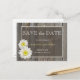 Rustic save the date postcards with white daisies on a weathered barn wood background.
