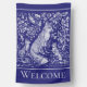 Welcome family and friends with an appealing fox family design in traditional dark blue and white! My artwork of three foxes among stylized flowers and foliage was originally painted on ceramic tile. Perfect for rustic country farmhouse or cottage decor but the classic blue and white theme will also be suitable to decorate a porch or doorway on any home, city or rural. My artwork was inspired by antique Delft and oriental chinoiserie pottery motifs and colors. This flag is printed on both sides with the greeting, "Welcome." A great housewarming gift or Fourth of July decor for your home. Whimsical, unique, original artwork & design by Tuzi Williams.