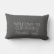 Rustic dark gray "welcome to our porch" script, family name Lumbar Pillow.
