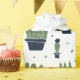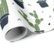 Wrapping paper with a rustic western flavor. Designed with a bunch of cute green cactuses in a repeating pattern. Specifically, green colored prickly cactus, in all kinds of shapes and sizes, each sitting in its own dark blue flower pot. Little decorative triangles in between them. Whimsical fun illustration.