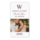 Elegant white serif typography pairs with a dark red monogram initial on this rustic wedding wine bottle favor label. Designed to wrap around mini wine bottles for a memorable reception keepsake. Personalize with the couple's names, monogram, wedding date, and add your own photo. A sophisticated finish for every wedding favor.