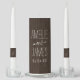 Rustic dark wood grain wedding unity candle set showcasing the couple's names in striking white typography with "and" in flowing script. The wedding date and monogram initials on each taper candle complete this bold natural design. All text is easy to personalize.