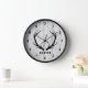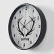 This clock features black deer antlers over a faux wood plank background for a rustic farmhouse look