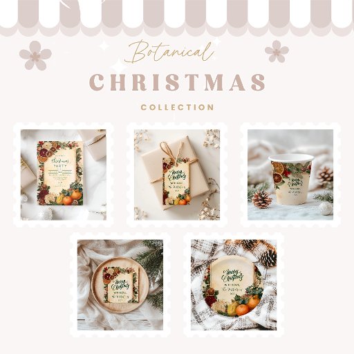 A warm rustic holiday design featuring dried oranges, winter fruits, roses, pine greenery, and seasonal florals. Perfect for sending cozy and traditional Christmas greetings with a vintage farmhouse touch.