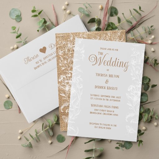 Rustic Dusty Blue Burlap Floral Lace Wedding Invitation