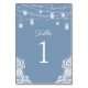 This lovely dusty blue table number card with string lights and mason jars at the top and beautiful lace edges at the bottom is light, airy and charming. The fonts are crisp and modern while being classic and traditional. It is perfect for any wedding theme. These are super easy to make your own. Simply select Personalize this template, type in the table number add to cart and continue doing so until you have all your table number cards made.