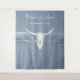 Dusty blue white rustic bull cow skull country western cowboy wedding reception photobooth backdrop. Vintage farmhouse style printed distressed texture. Wild west style old antique marriage prop. Cool, trendy, modern farm animal design. Customize your script. Image copyright Marg Seregelyi Photography.