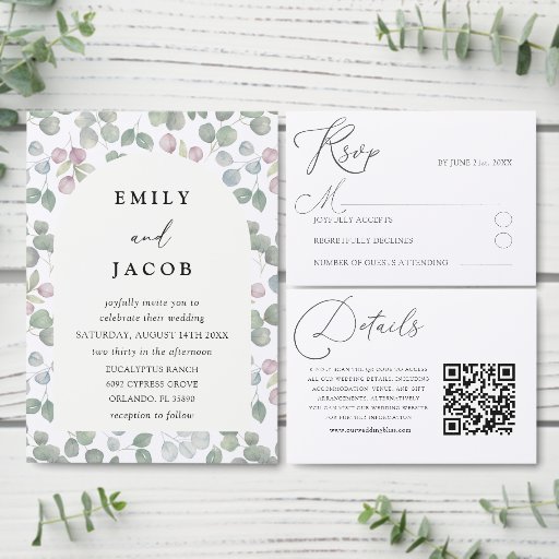 Announce your celebration in timeless style with our elegant real gold calligraphy wedding invitation. The background showcases original watercolor artwork featuring romantic eucalyptus foliage in soft tones of sage green, dusty blue, and deep rose, evoking a lush botanical charm. A mid-tone dusty rose arch elegantly frames your personalized wedding details, creating a modern yet romantic focal point. This invitation blends natural beauty with contemporary design and is fully customizable—perfect for garden weddings, boho celebrations, or elegant rustic themes. Personalize with ease to create a heartfelt keepsake that reflects the beauty and significance of your special day.