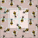 A pattern of yellow and black striped, illustrated, rustic bees swarm across this soft pink fabric.