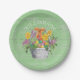 This personalized floral Easter themed paper plates features a rustic design of a white basket of yellow and purple spring flowers and Easter eggs in shades of yellow, purple, green and turquoise with your family name in white typography on a faux green weathered wood background. Designed by world renowned artist ©Tim Coffey.