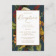 Ethereal floral bouquets with shades of dark red, rusty orange, yellow to harvest gold and lush greenery give this dark botanical "Reception" design a look of deep, rich modern rustic elegance that is sure to impress your recipients. Available in a variety of colors. Shown here with a dark teal background on front and terracotta / rusty orange on back. Modify all template fields as desired except for "Reception" which is uneditable except by the designer. Composite design by Holiday Hearts Designs (rights reserved).