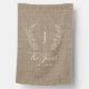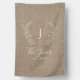 Personalized white monogram, family name, and established year elegant rustic country dark beige burlap house flag. +++++++ A modern gift for housewarming, weddings, newlyweds, anniversaries, Thanksgiving, Christmas, or any other occasion.