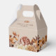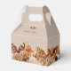 This elegant fall wedding favor box features hand-painted watercolor burnt orange and terracotta leaves, cream and beige dahlias, and beautiful rust-colored roses on a taupe background with the bride and groom's name and wedding date in brown text. Find matching items in the Taupe Autumn Romance Collection.