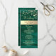 Guide your guests through your special day with this elegant boho wedding program, featuring a rustic wood background, rich emerald green accents, vintage gold floral lace, and twinkling string lights. This design blends modern sophistication with rustic charm, making it perfect for fall, winter, or outdoor weddings. Personalize with your ceremony details to create a stylish and memorable keepsake for your guests.