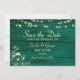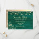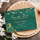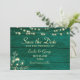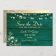 Announce your big day with our elegant, boho save the date invitation. Featuring rustic wood and emerald green accents, it showcases gold gilded floral lace and string lights for a charming touch.