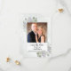 This wedding save the date card is simple, rustic, elegant, and beautiful. It features your photo in a white frame surrounded by a bevy of hand painted watercolor eucalyptus leaves and lavender flowers on a marbled pale steel blue background. The title reads: Save the Date in lacy script calligraphy with room for the names of the couple, the date and location. The back has a small bouquet tied with a white bow. Wonderful way to let your friends and family know about your upcoming wedding.