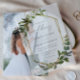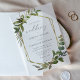 This elegant rustic vellum wedding invitation features a gold faux foil geometric frame decorated with eucalyptus greenery. The word "wedding" appears in calligraphic script. Customize the charcoal gray text with the names of the bride and groom and the wedding details. (The bottom photo card layer, sold separately, is available in the collection below.)