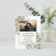 These save the date cards are a great way to let your friends and family know about your upcoming wedding. They feature a rustic design with your photo surrounded by hand painted sprigs of eucalyptus leaves and pine branches in shades of sage green and gold on a white background. The title is written in lacy script calligraphy with room for the names of the couple, the wedding date, location, and website.