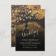 This wedding Save the Date card is rustic, elegant, and beautiful. It features an autumn or fall tree at sunset or dusk, adorned with strings of golden lights. The text is written in fancy script calligraphy, and there is space for the names of the couple, the wedding date, and location. The back features the same tree on a vintage faux parchment background. Perfect for an outdoor, evening, country, or backyard wedding.
