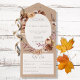 AVAILABLE WITH OR WITHOUT A QR CODE TO SCAN OR WITH OR WITHOUT DINNER OPTIONS. This all in one wedding invitation design features a soft watercolor frame of fall flowers, leaves, and pumpkins in brown, beige, rust, green, and blush on a vintage distressed light brown background. Created by Simply Farmhouse Press.