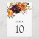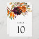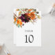 Rustic boho floral Wedding Table Number featuring a watercolor painted floral bouquet with warm and earthy shades of burnt orange, terracotta and deep burgundy along with some greenery. This elegant Table Number with the rich shades of autumn is great for a fall wedding.