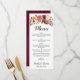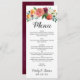 Wedding menu card design features Menu in script with custom wording and a monogram that can be completely personalized, framed by a rustic summer and fall floral watercolor design with beautiful roses, dahlias, peony flowers, and greenery, in a gorgeous autumn palette of burgundy red, golden yellow, peach orange, blush pink, and shades of green. A burgundy red background color with a textured appearance dresses up the back of the card.