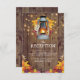 Rustic country wedding reception cards featuring a wooden barn background, autumn leaves, a candle lit lantern, string twinkle lights and a modern wedding template.