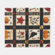 This blanket showcases a rustic quilt-inspired pattern arranged in squares and rectangular blocks with warm autumn motifs. The patchwork features pumpkins, a black bird with a reddish breast, hearts, red stars, and floral branches in earthy shades of red, orange, and brown. Geometric accents like plaid and cross-stitch textures add to the handmade feel. With a cozy farmhouse aesthetic in black, cream, and fall tones, this pattern is perfect for autumn décor, primitive country style, and rustic harvest season charm.