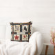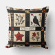 This throw pillow showcases a rustic quilt-inspired pattern arranged in squares and rectangular blocks with warm autumn motifs. The patchwork features pumpkins, a black bird with a reddish breast, hearts, red stars, and floral branches in earthy shades of red, orange, and brown. Geometric accents like plaid and cross-stitch textures add to the handmade feel. With a cozy farmhouse aesthetic in black, cream, and fall tones, this pattern is perfect for autumn décor, primitive country style, and rustic harvest season charm.