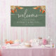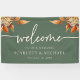 Rustic Fall Welcome Wedding Banner. This elegant wedding banner features hand-painted watercolor burnt orange and terracotta leaves, cream and beige dahlias, and beautiful rust-colored roses on a sage green background with cream text. Find matching items in the Sage Autumn Romance Collection.