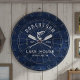 Add a personalized touch to your family lake house or mountain lakeside cottage with this rustic dartboard, featuring crossed oars and a jumping fish on a rustic navy blue wood background, with family name, lake house location and established date in easy to use text templates.