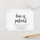 This is the Wedding party or any celebration invitation Rescheduled (postponed / postponement) postcard (love is patient), in modern rustic farm design themed, Black font. It is the perfect and best way to make the event reschedule announcement to your family and friends.