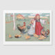 Nostalgic vintage Easter card featuring two little farm girls in a field, one ringing a bell, while a hen, rooster and chicks feed at their feet. Includes A Happy Easter message.