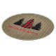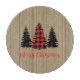 Rustic farmhouse holiday design features a trio of Evergreen tree silhouettes, one in red and black buffalo plaid, "Merry Christmas" text in festive red, and a muted vintage striped background