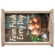 Serve in style with this rustic farmhouse serving tray featuring eggs in a basket and the editable quote “Farm Fresh Every Day – [Name]’s Kitchen”. A versatile piece for farmhouse kitchens, breakfast in bed, or as a charming rustic gift.
