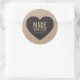 Rustic style sticker with the words "Made with Love" in bold font and a stylish script for your name or store name in brown over a grey heart against a kraft like pattern background. Use this "Handmade" sticker for labeling and packaging your handmade goods.