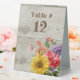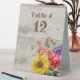 Rustic tent style wedding table number sign done in a light wood fence background, with vintage graphics of a colorful flower bouquet. Personalize the text for each table at your reception.