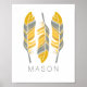A trio of stylized feathers in earthy tones of yellow, gold, gray, and cream, personalized with your child's name or any text of your choosing.