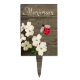 Mark your herbs, vegetables, or flowers with this lovely plant stake, with graphics of a rustic wooden fence, with white dogwood blooms, on the bottom left. Graphics of a cute red and black ladybug appears to be resting on the marker. Antique white script text, at the top, is ready to personalize to read what you want. Make one for each plant you want marked.