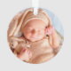 Rustic new grandparent christmas ornament featuring a dark wooden background, festive christmas tree branches, red & gold tree decorations, string twinkle lights, the cute saying 'our first christmas as grandparents', their names, and the year. On the reverse is a photo of their grandchild.