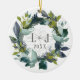 This rustic holiday ornament is perfect for couples newly engaged. The design features a watercolor botanical wreath in shades of light blue, green, and teal with your monogrammed initials and year for you to personalize on a white and gray faux weathered wood background. The back of the ornament has your custom photo with the words "Our First Christmas Engaged". Best of luck on your upcoming wedding. Happy holidays from our family to yours!