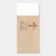 A simple rustic design for first communion favors: just a wood cross on light wood background, with text under it, the name being written in a brown handwriting script.