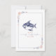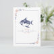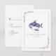Wedding RSVP with fish illustration with botanical seashell border. Color scheme is red and blue.
