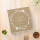 This wedding photo album features a rustic floral botanical white wreath on a brown faux kraft paper background.